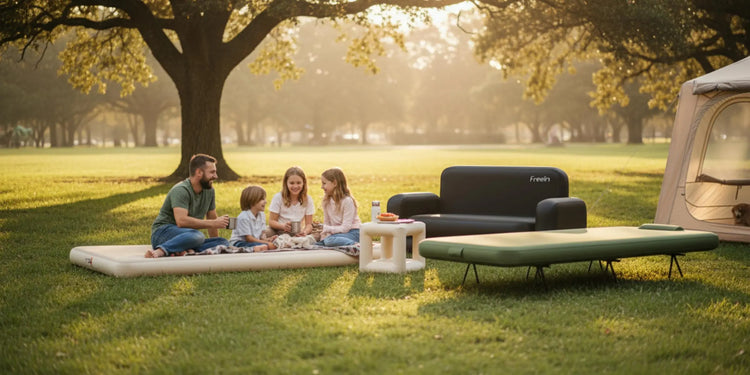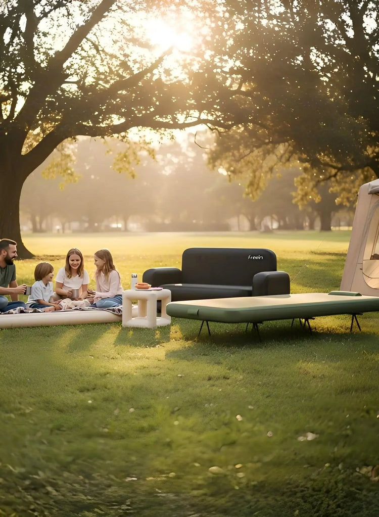 FREEIN's inflatable Camp System brings real mattress comfort to your family campsite, guest room, and everything in between. High-pressure drop-stitch technology — in a bag.